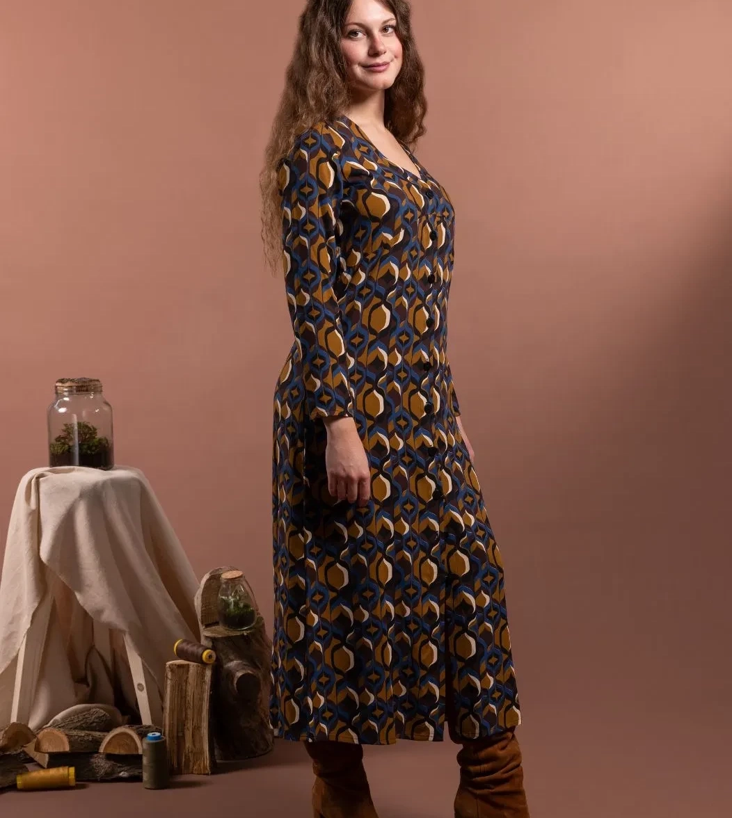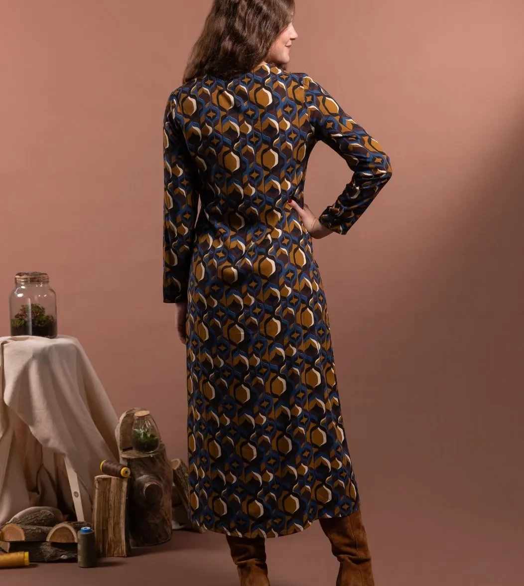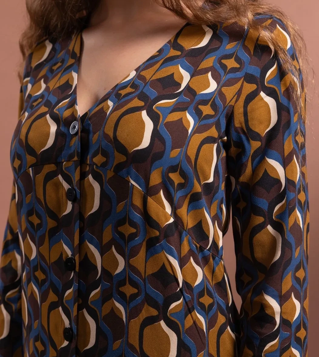 Abito chemisier con scollo a V e abbottonatura frontale fino al polpaccio. Le pinces anteriori valorizzano il busto e la silhouette, il taglio morbido scivola in modo naturale lungo i fianchi. Realizzato in fantasia geometrica nei toni autunnali del blu, del giallo senape e del marrone cioccolato, ADALIA è perfetto sia per momenti speciali che per tutti i giorni. Ogni linea di ADALIA riflette eleganza naturale che si muove con chi lo indossa.