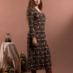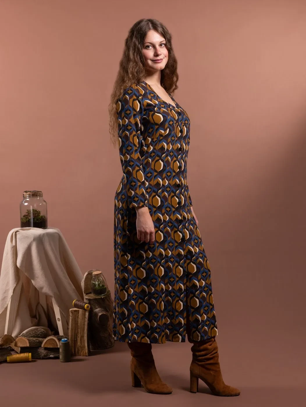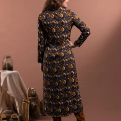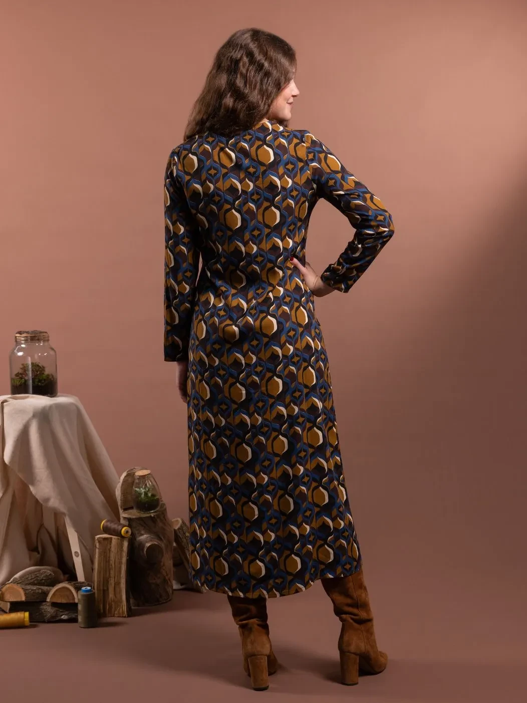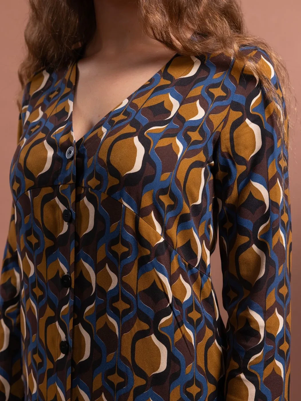 Abito chemisier con scollo a V e abbottonatura frontale fino al polpaccio. Le pinces anteriori valorizzano il busto e la silhouette, il taglio morbido scivola in modo naturale lungo i fianchi. Realizzato in fantasia geometrica nei toni autunnali del blu, del giallo senape e del marrone cioccolato, ADALIA è perfetto sia per momenti speciali che per tutti i giorni. Ogni linea di ADALIA riflette eleganza naturale che si muove con chi lo indossa.