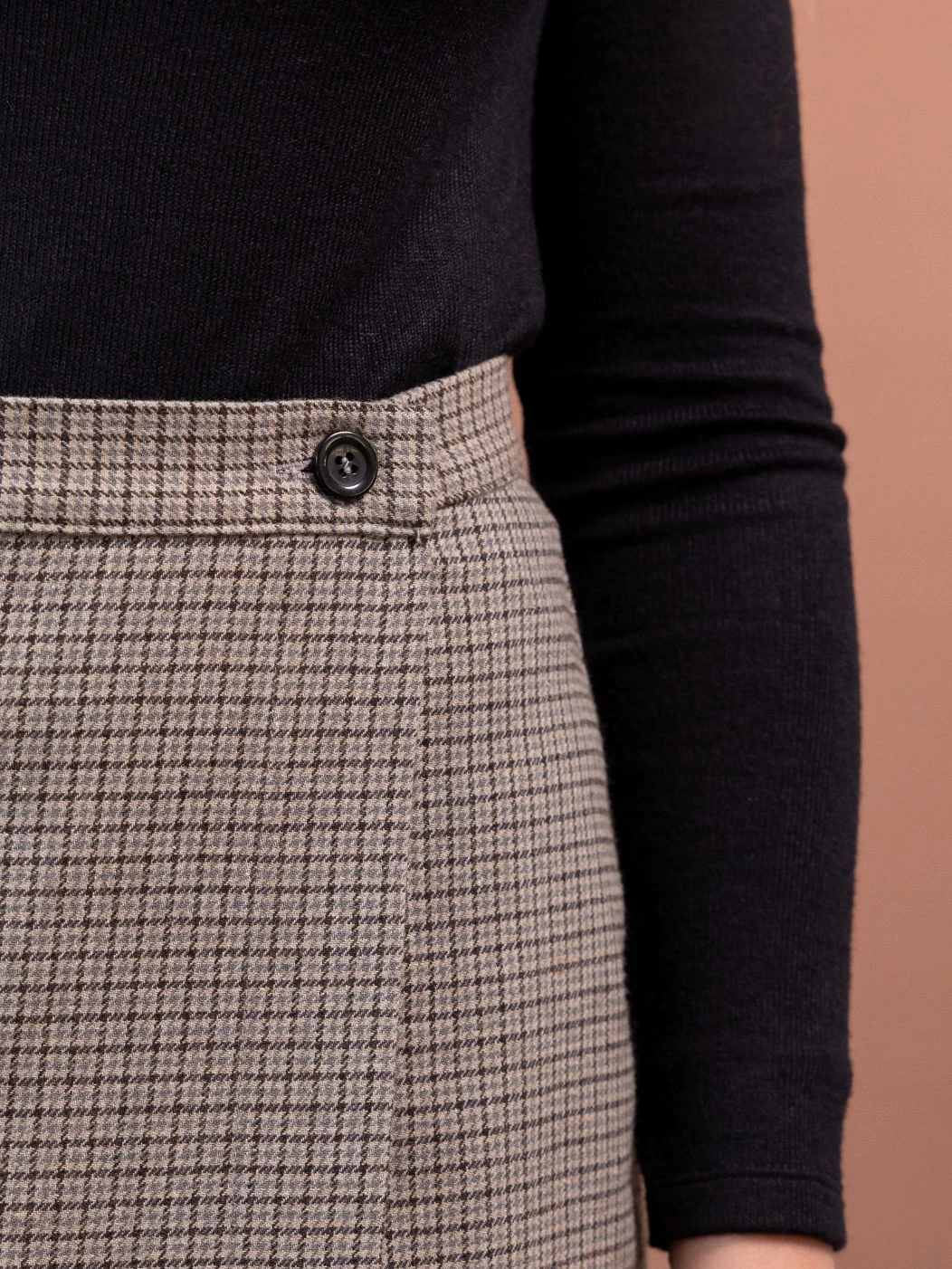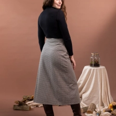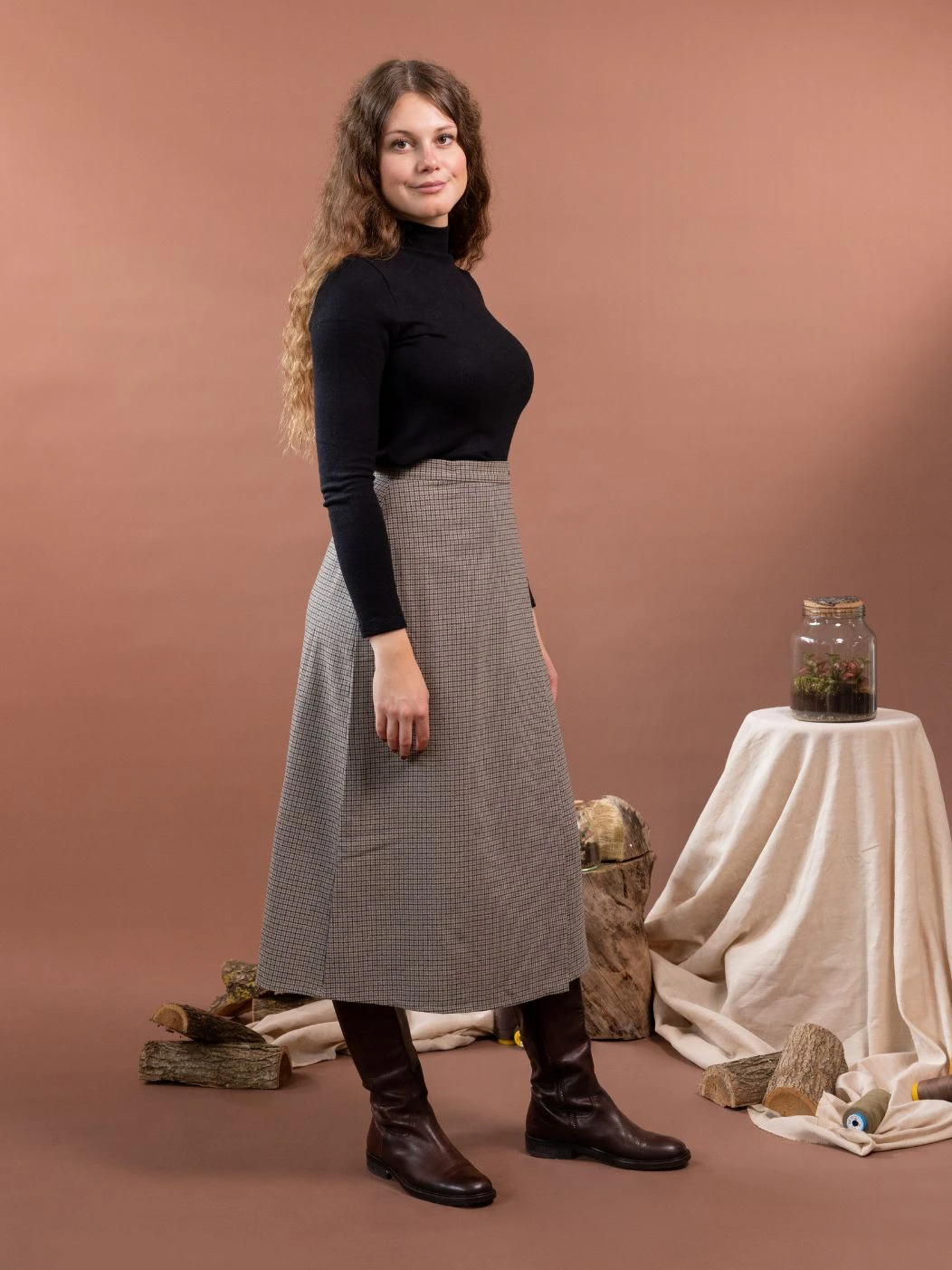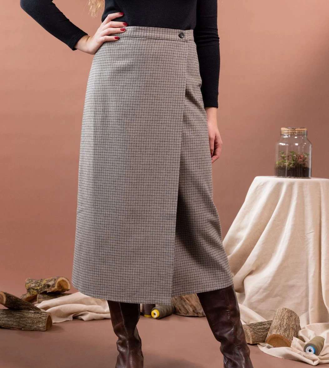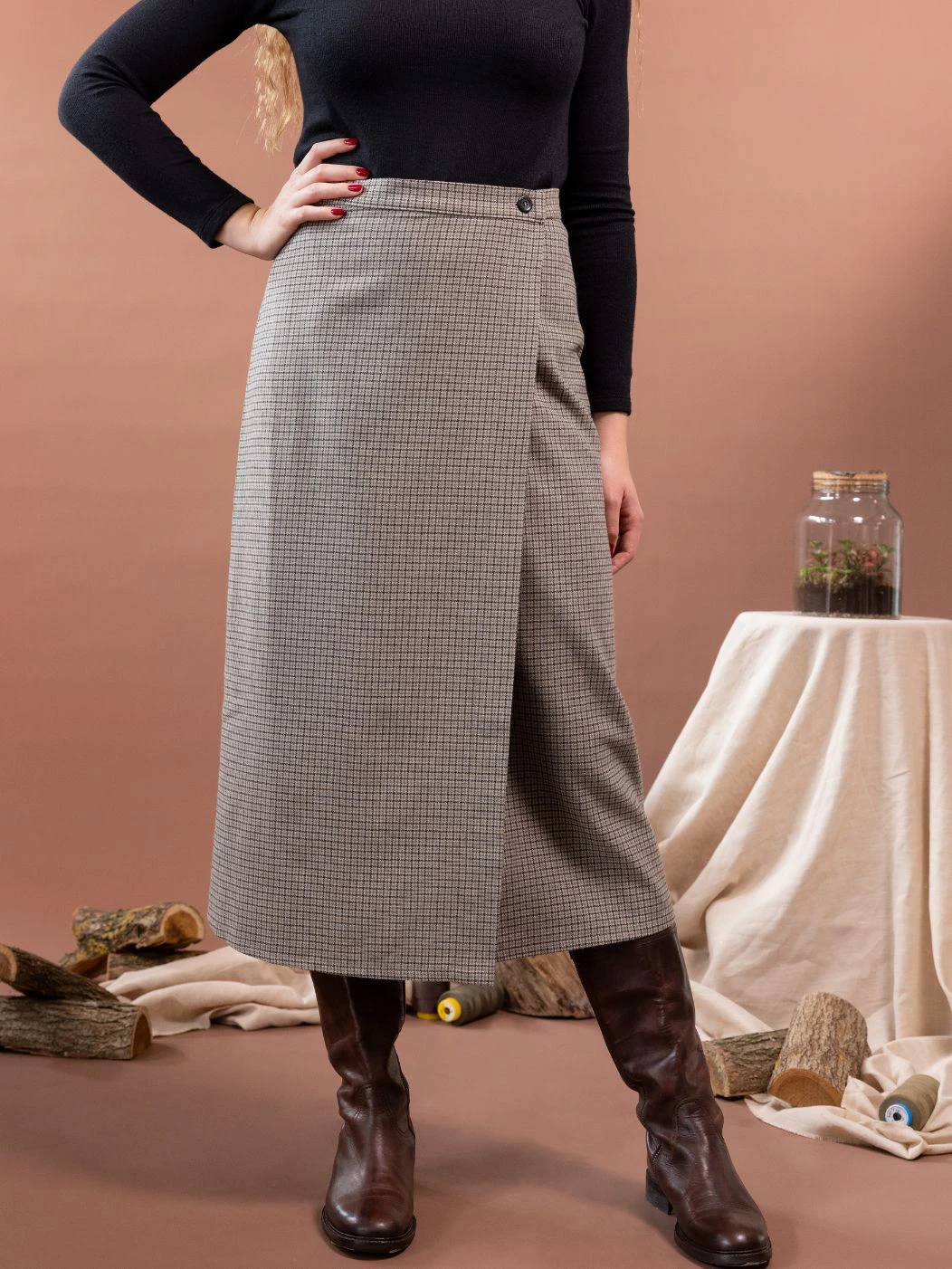Gonna a portafoglio in lana in fantasia tartan, lunga fino al polpaccio, dal taglio dritto che cade dolcemente adattandosi ad ogni silhouette. La chiusura frontale con doppio bottone e la fascia in vita aggiungono un dettaglio distintivo e un tocco femminile. Versatile, si abbina facilmente a camicie o maglioncini. Disponibile in quattro varianti colore, TOMSK incarna TERRARIUM, in cui i dettagli e gli abbinamenti dialogano in perfetta armonia.