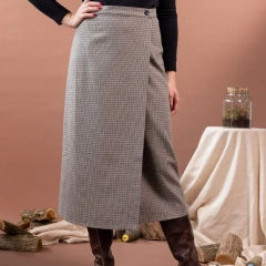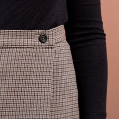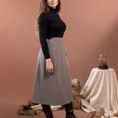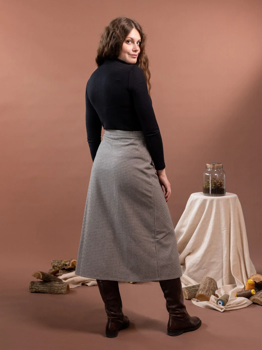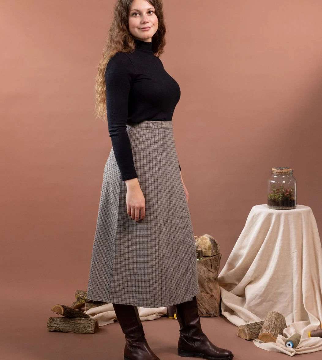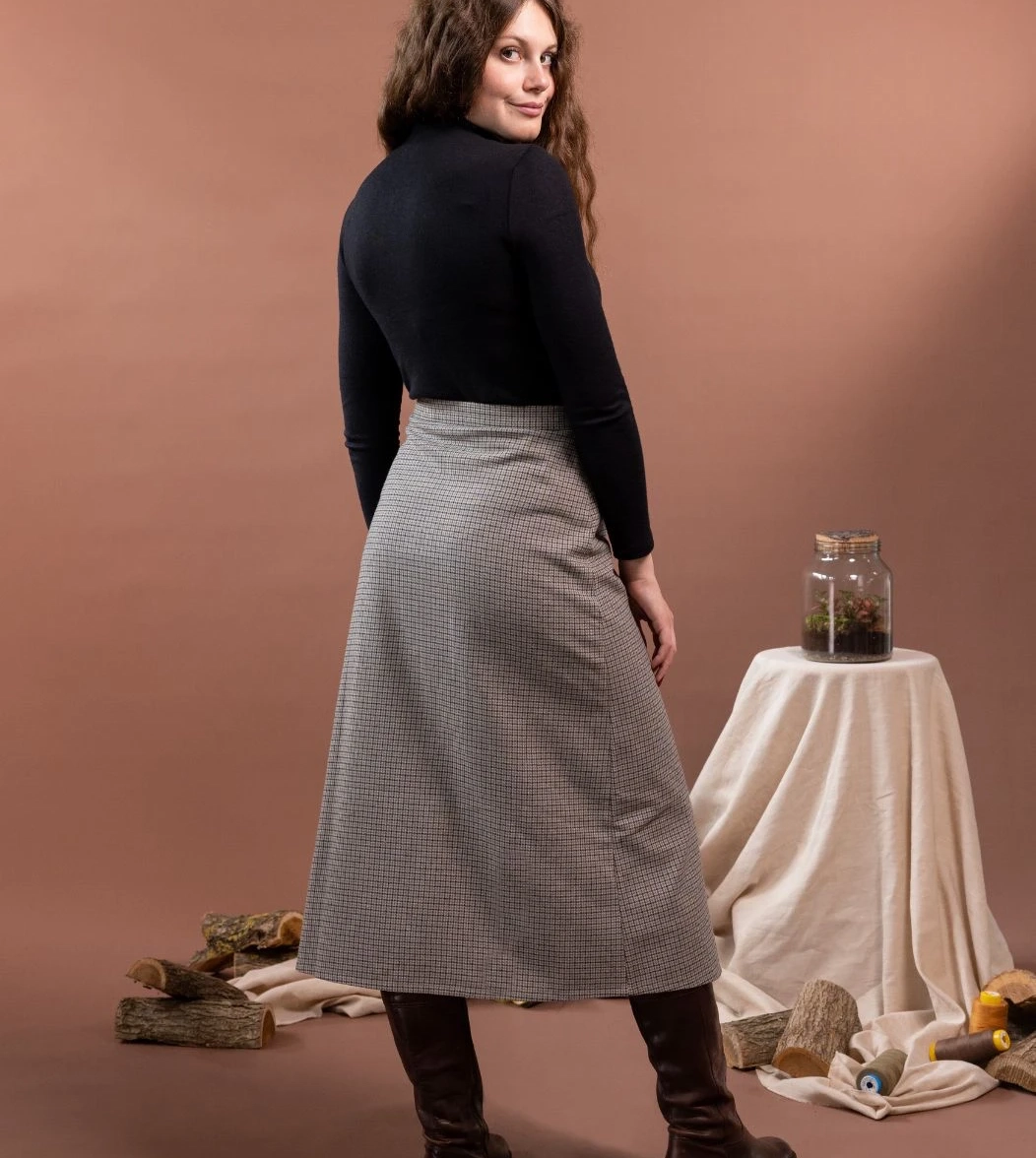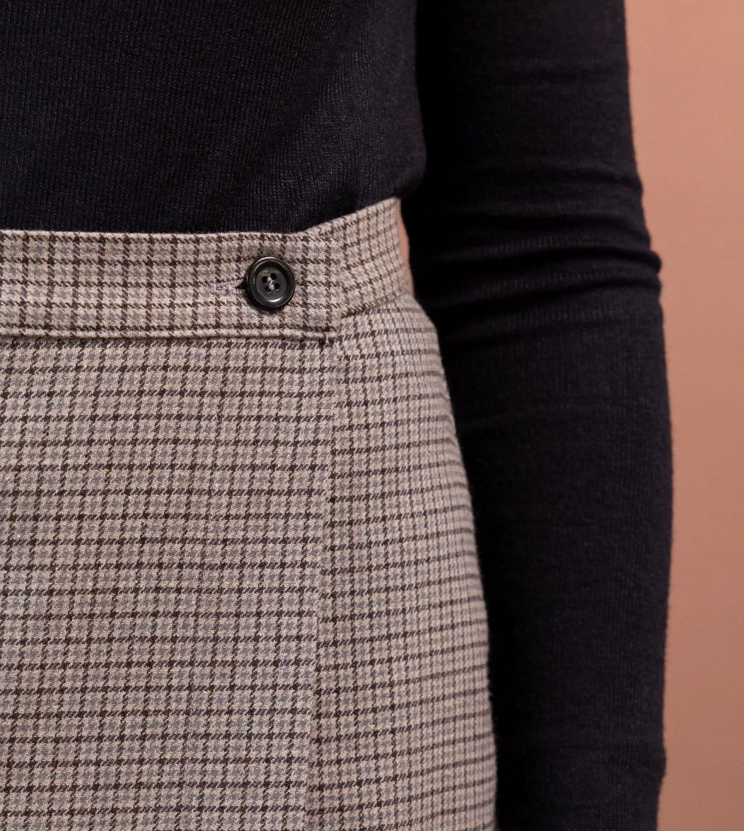 Gonna a portafoglio in lana in fantasia tartan, lunga fino al polpaccio, dal taglio dritto che cade dolcemente adattandosi ad ogni silhouette. La chiusura frontale con doppio bottone e la fascia in vita aggiungono un dettaglio distintivo e un tocco femminile. Versatile, si abbina facilmente a camicie o maglioncini. Disponibile in quattro varianti colore, TOMSK incarna TERRARIUM, in cui i dettagli e gli abbinamenti dialogano in perfetta armonia.