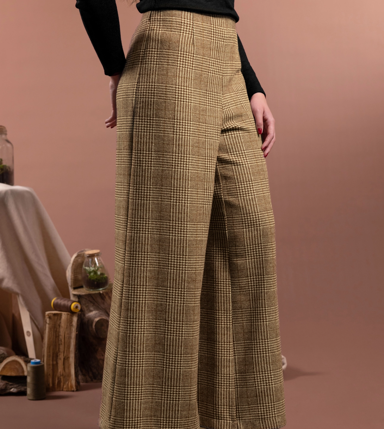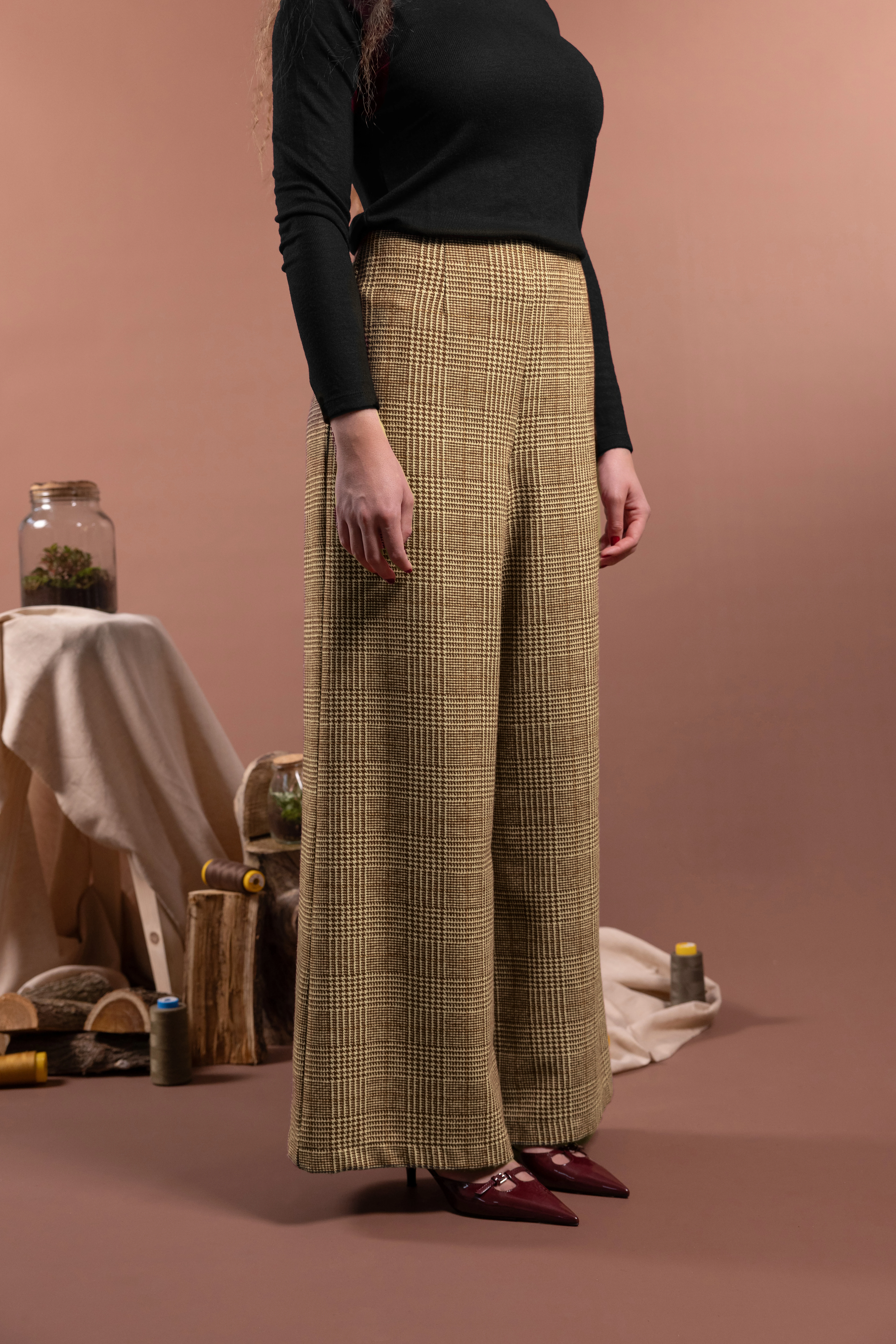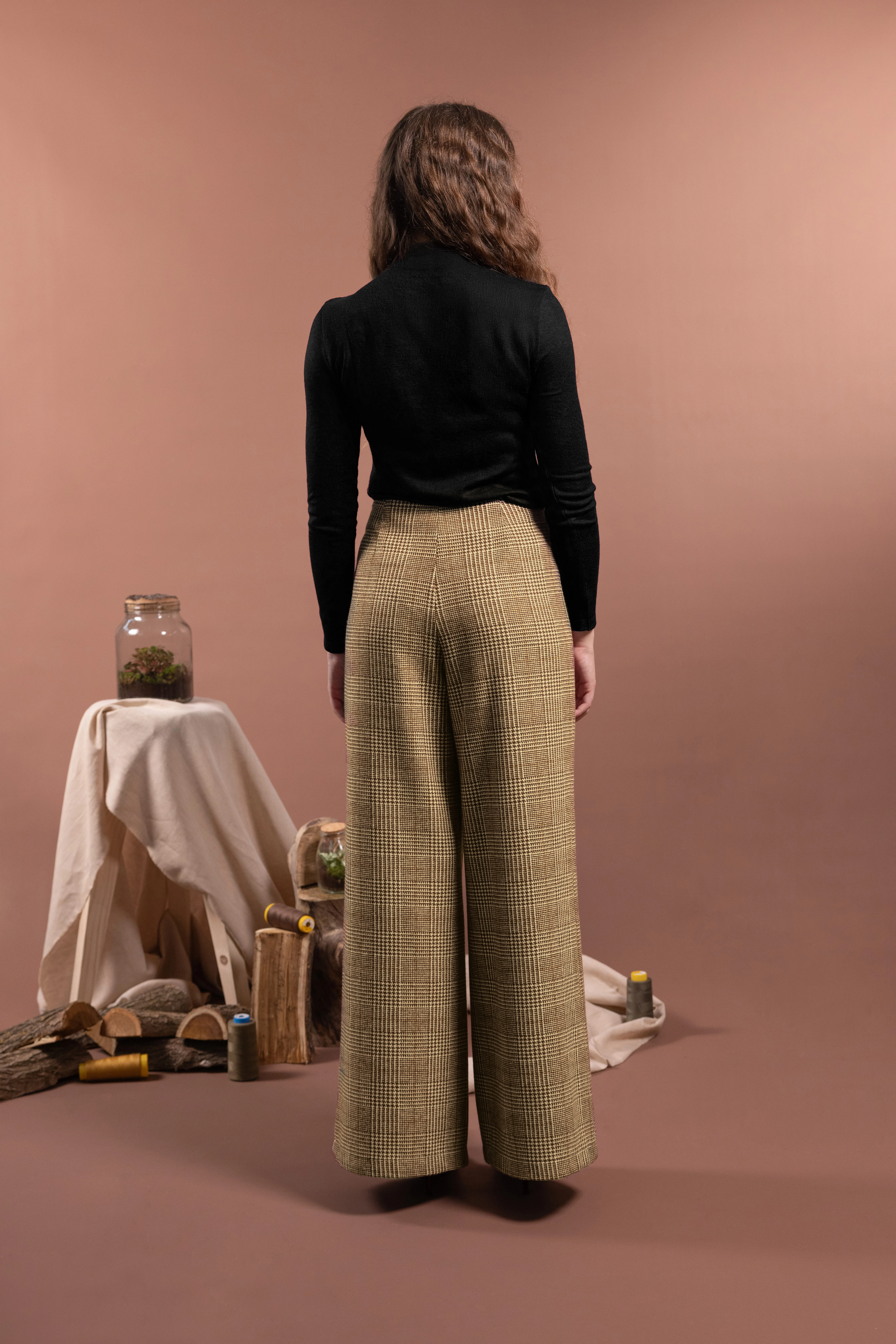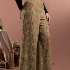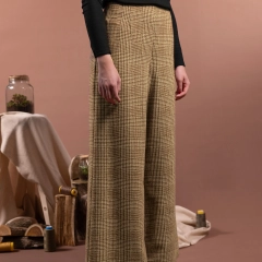 Pantaloni palazzo in lana e in fantasia tartan con gamba ampia, fascetta sagomata in vita e chiusura laterale con zip invisibile. La gamba larga senza tasche crea una linea elegante e morbida. Ogni dettaglio è studiato per creare armonia e proporzione con gli abbinamenti.