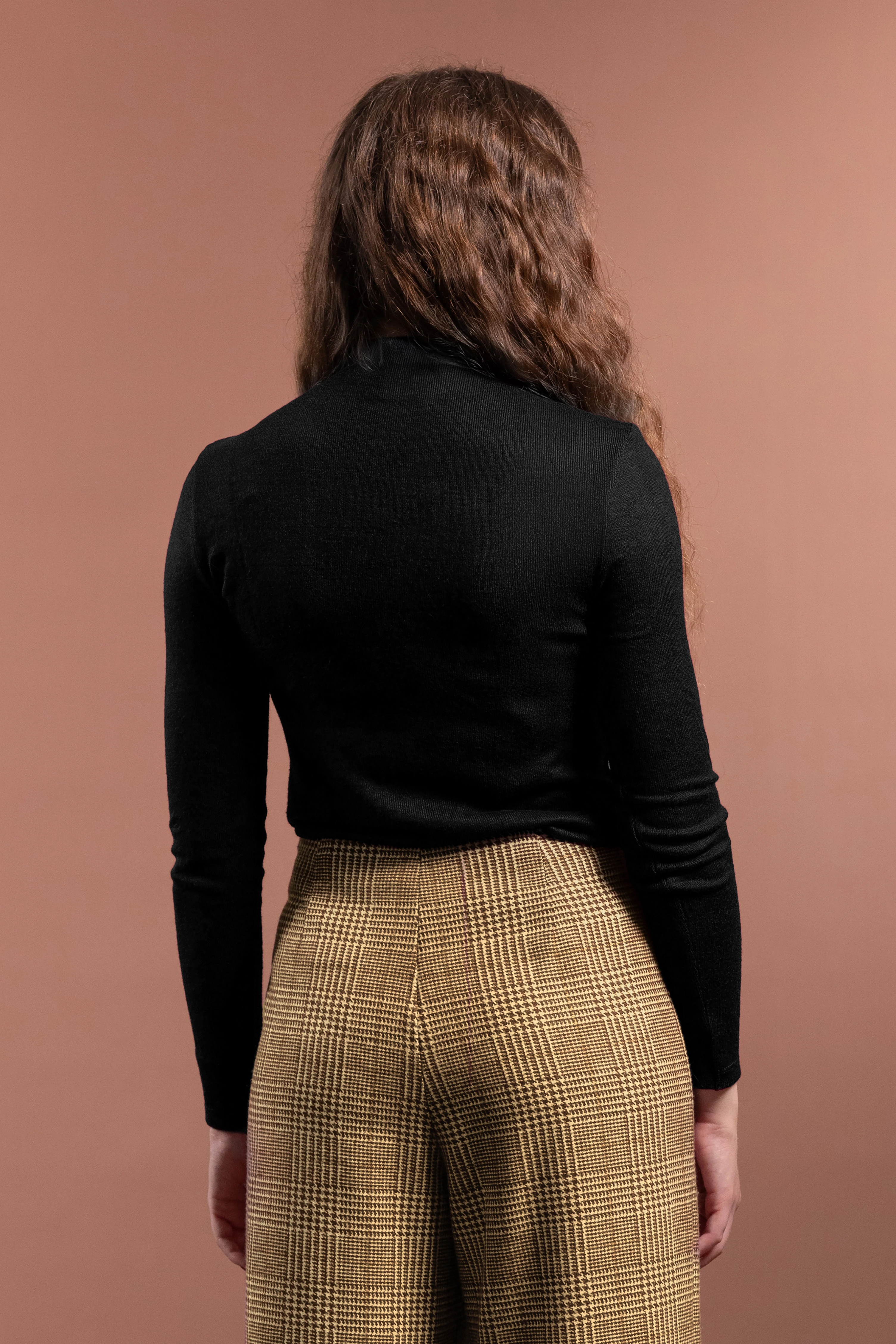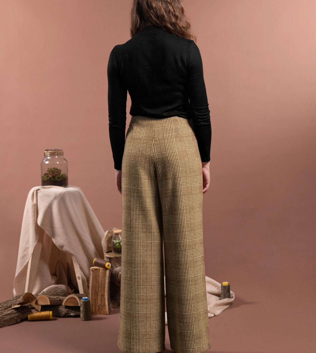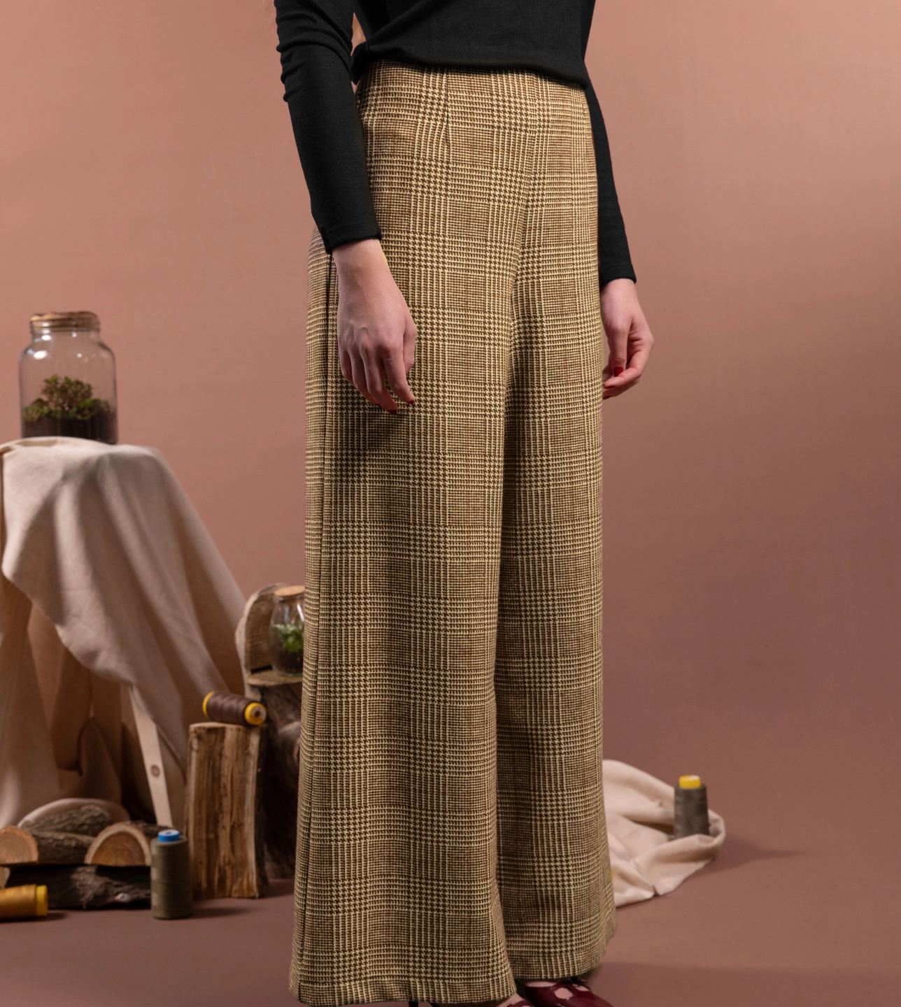 Pantaloni palazzo in lana e in fantasia tartan con gamba ampia, fascetta sagomata in vita e chiusura laterale con zip invisibile. La gamba larga senza tasche crea una linea elegante e morbida. Ogni dettaglio è studiato per creare armonia e proporzione con gli abbinamenti.