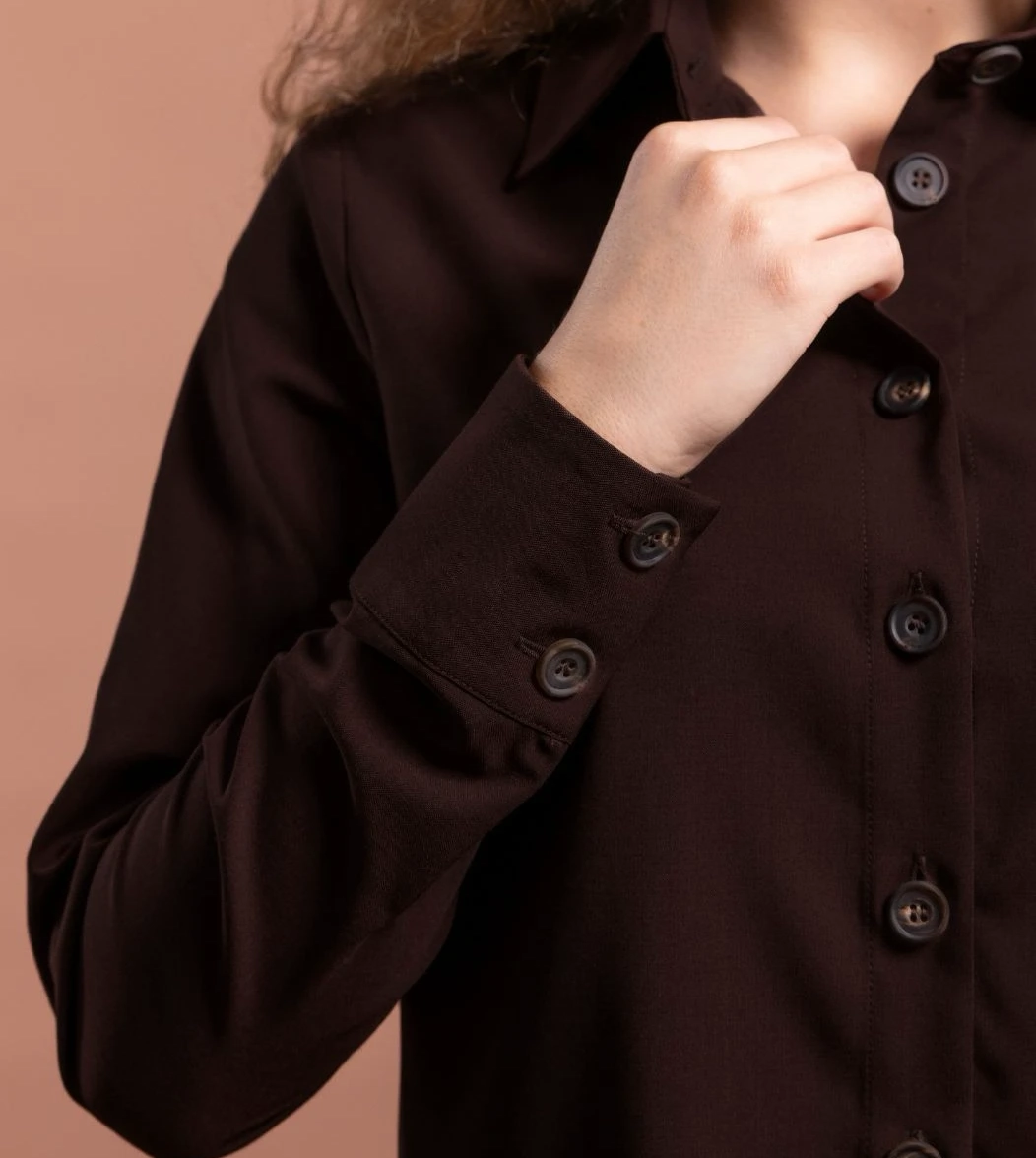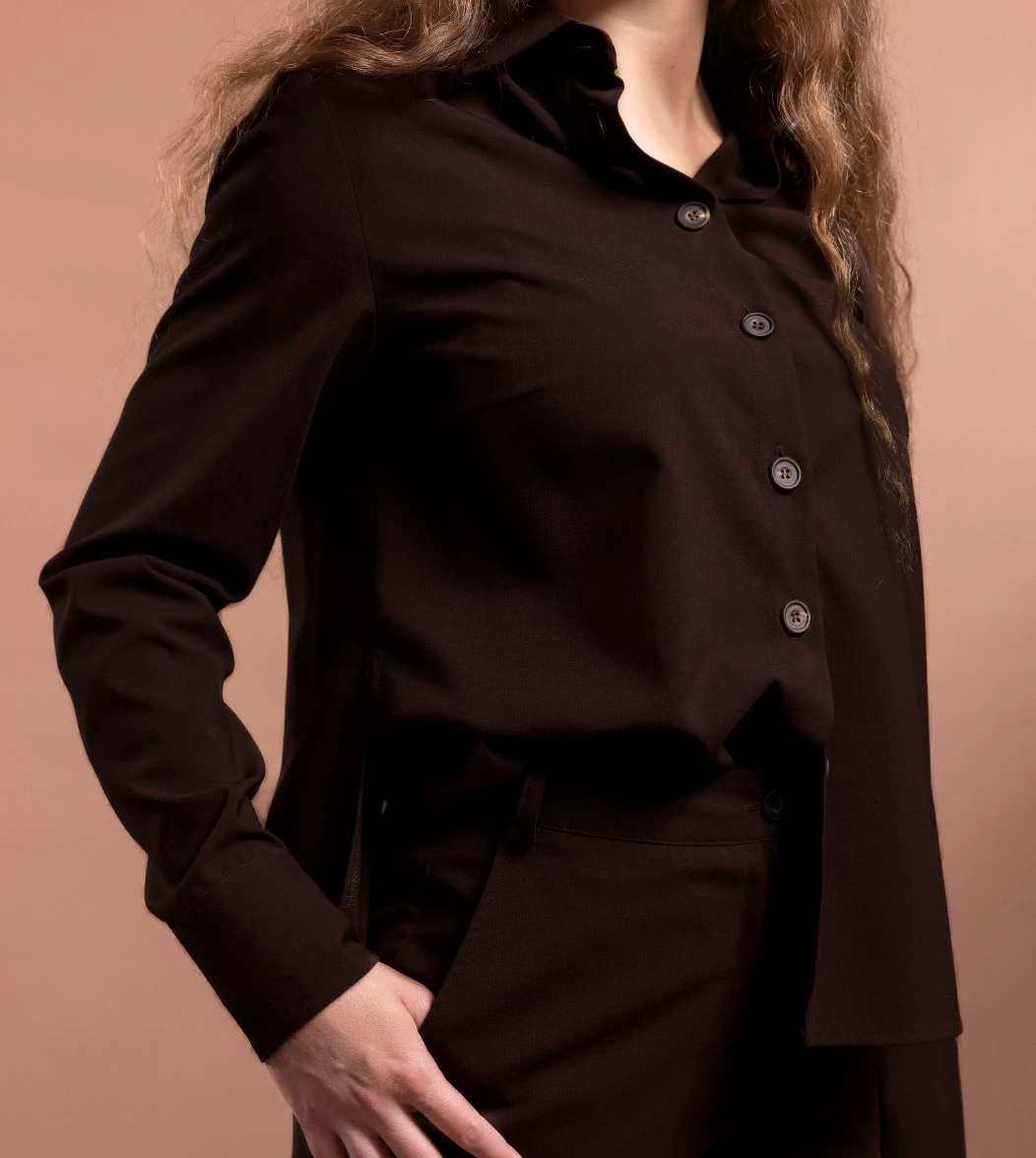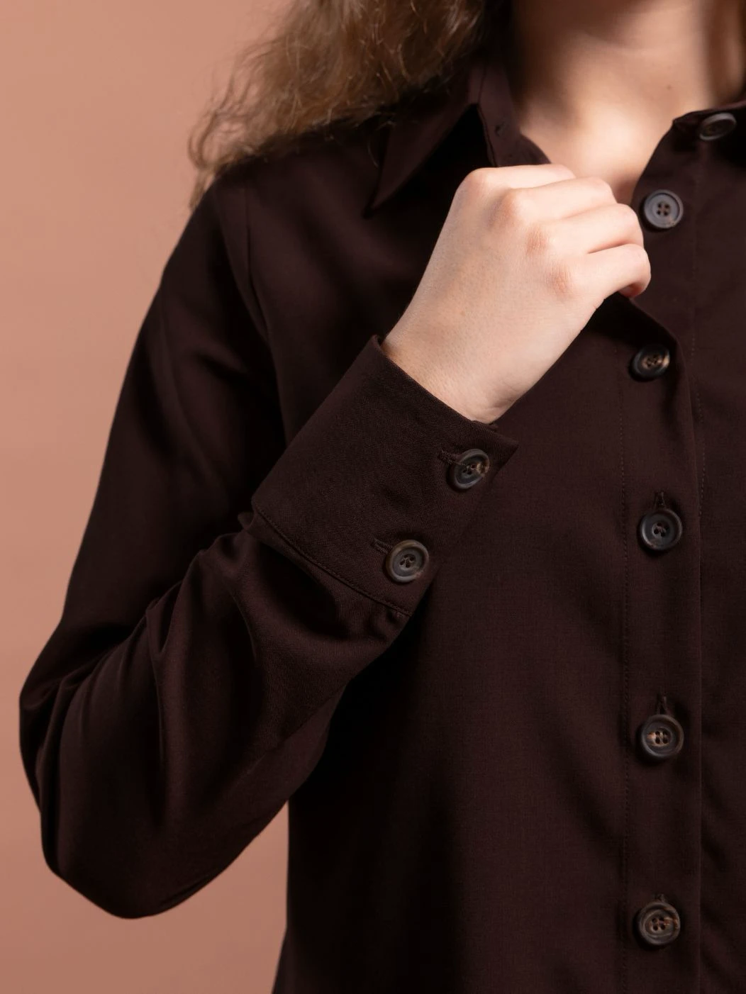 Rachel è la camicia in frescolana nei colori cioccolato e moka dal taglio dritto e pulito. Con colletto classico, abbottonatura frontale, fondo e polsini rifiniti con doppio bottone. I caratteristici spacchi laterali la rendono versatile, perfetta da portare dentro o fuori dai pantaloni. Vestibilità e spalline regolari per un capo semplice ma raffinato in perfetto abbinamento con i pantaloni Dena.