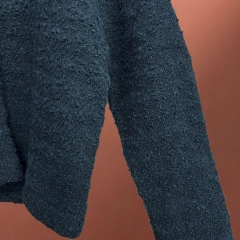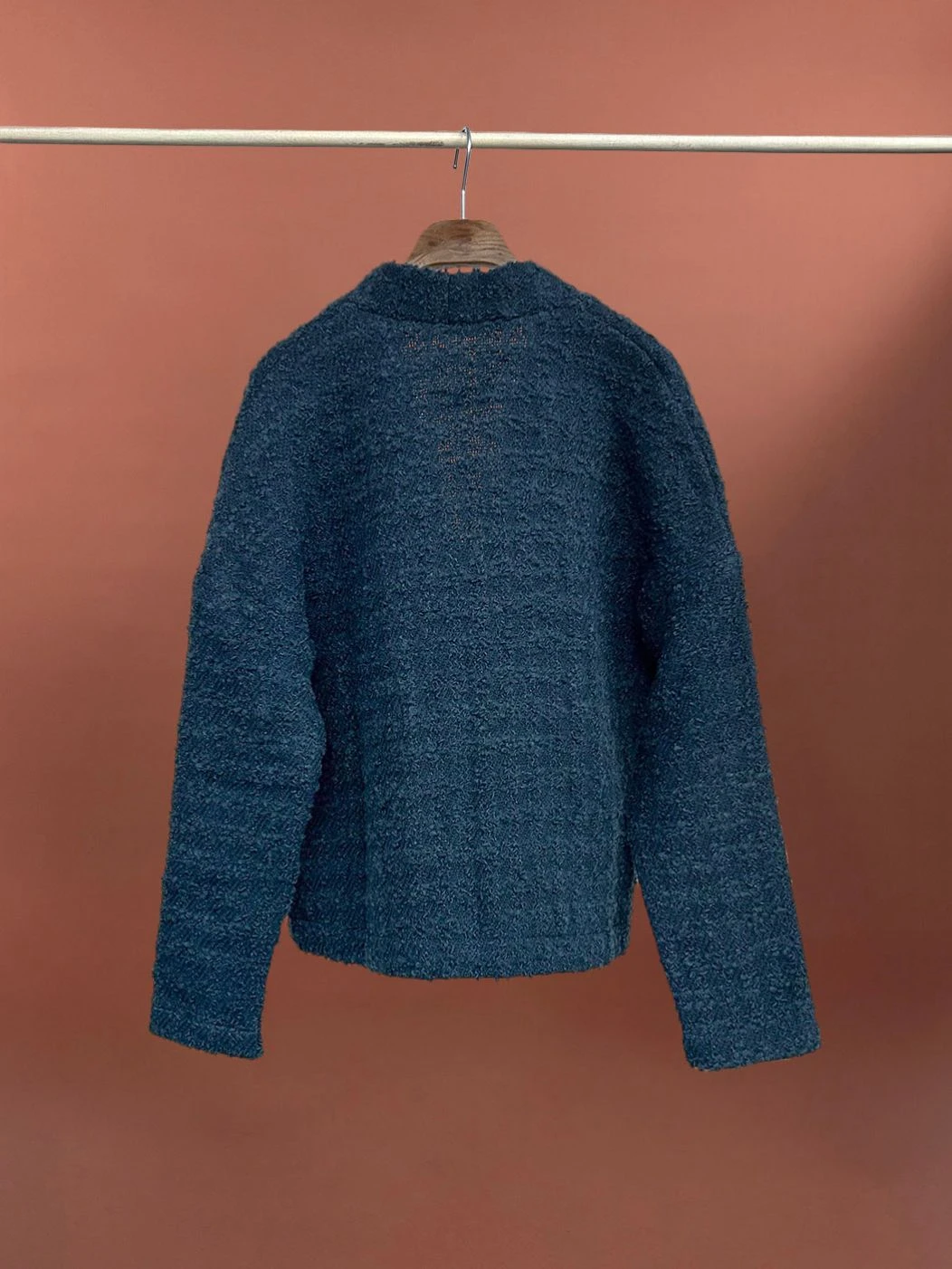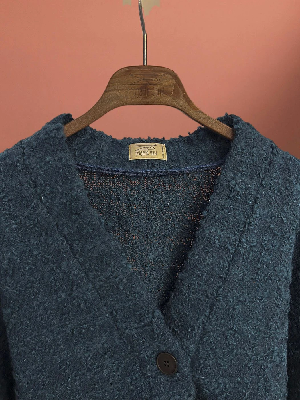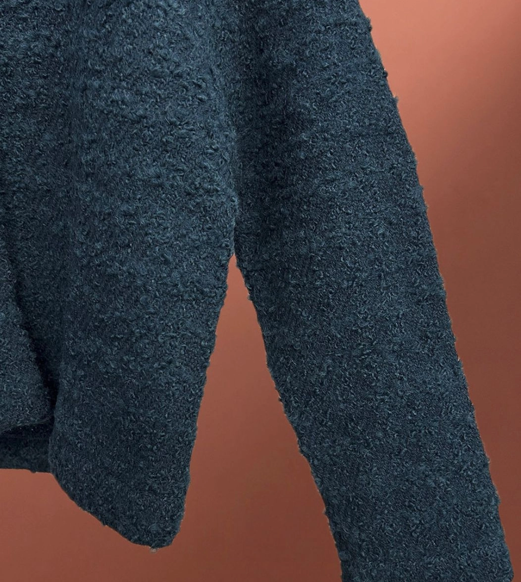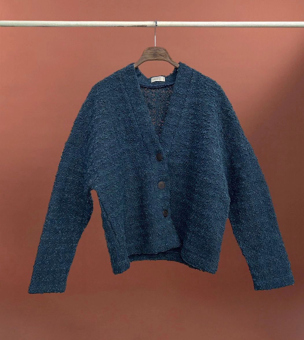 Termoli è il cardigan in lana dal taglio legermente over, caratterizzato da spalla bassa, chiusura centrale a tre bottoni e vestibilità fit-regular morbida.