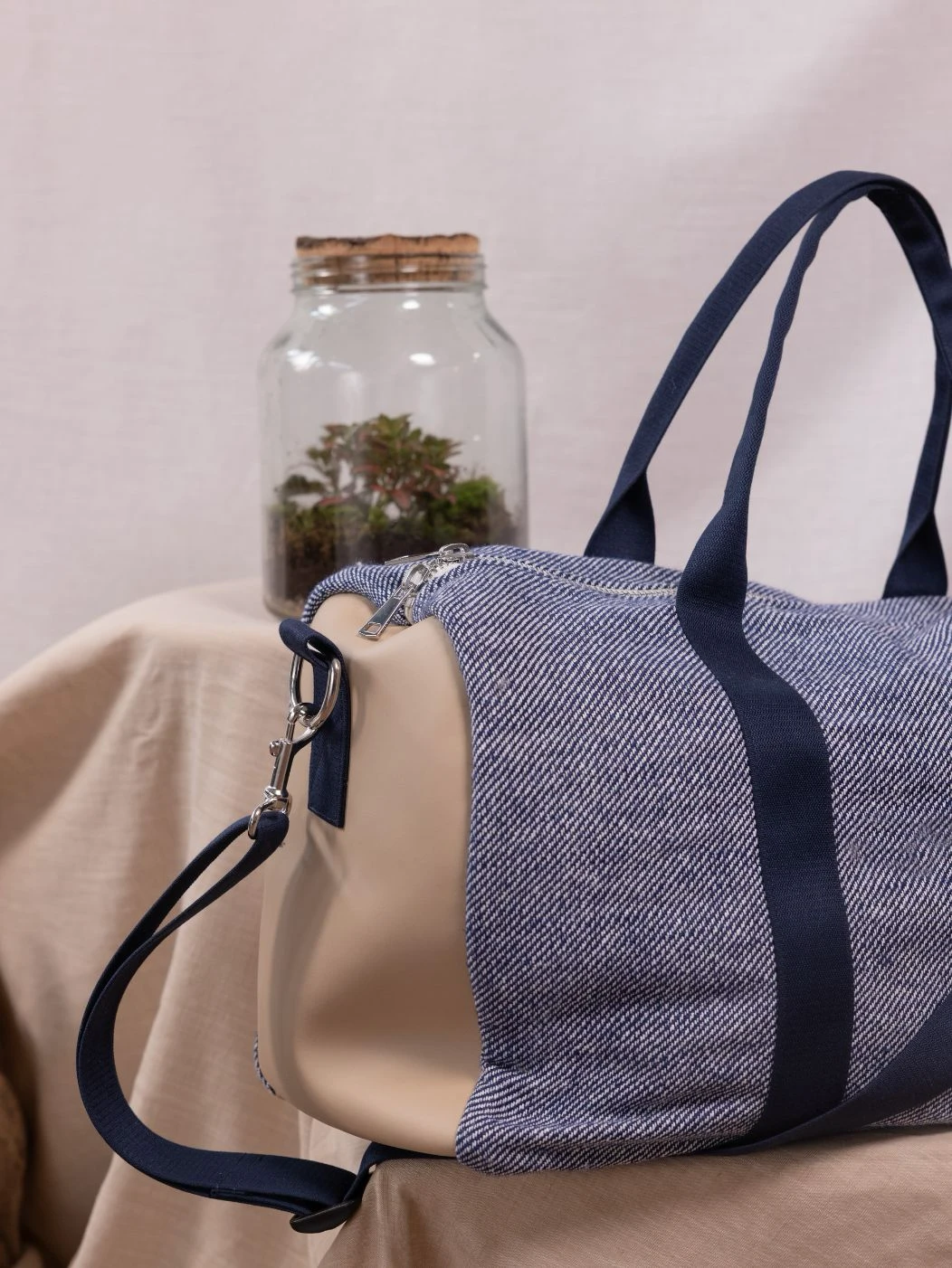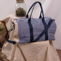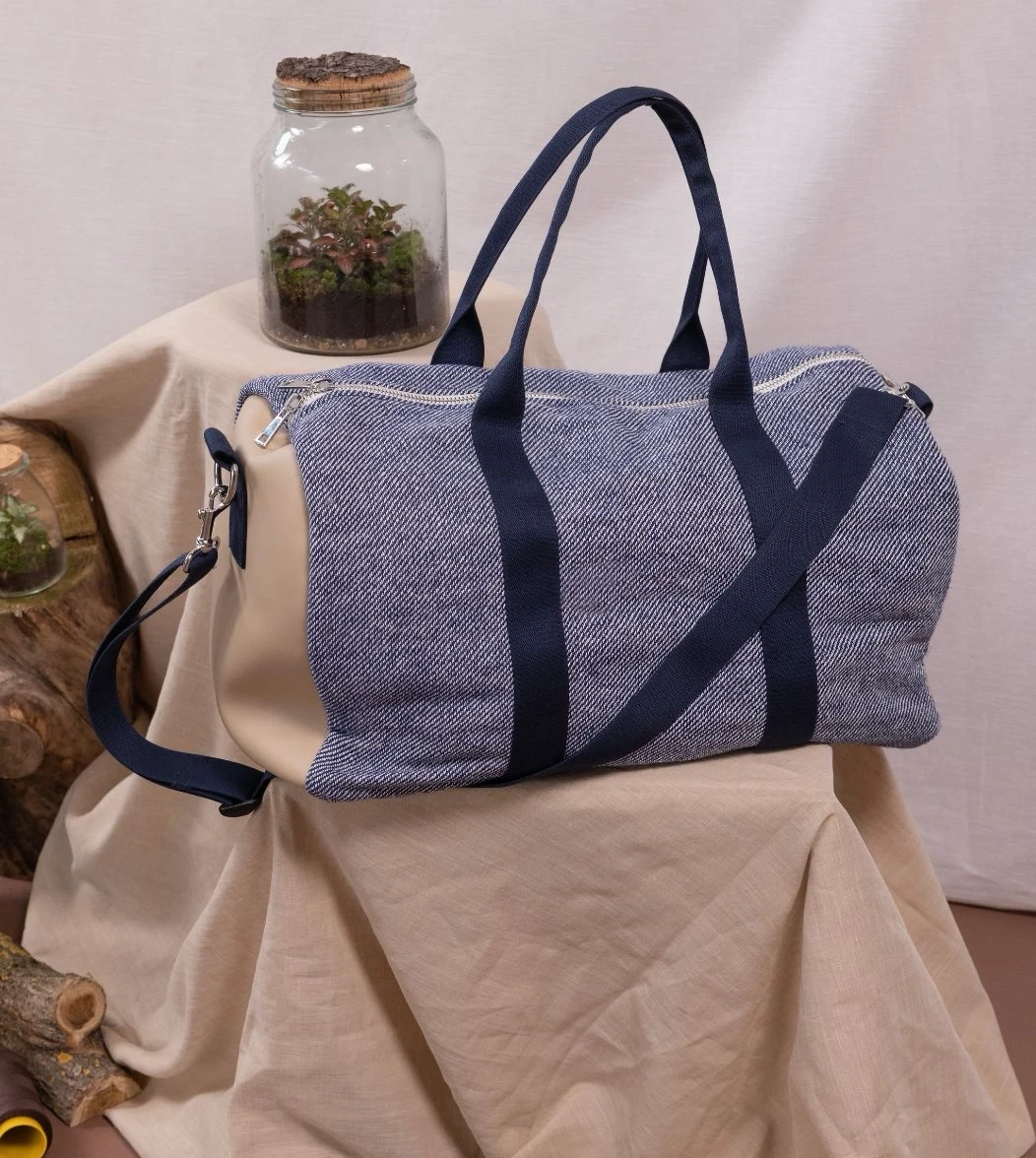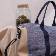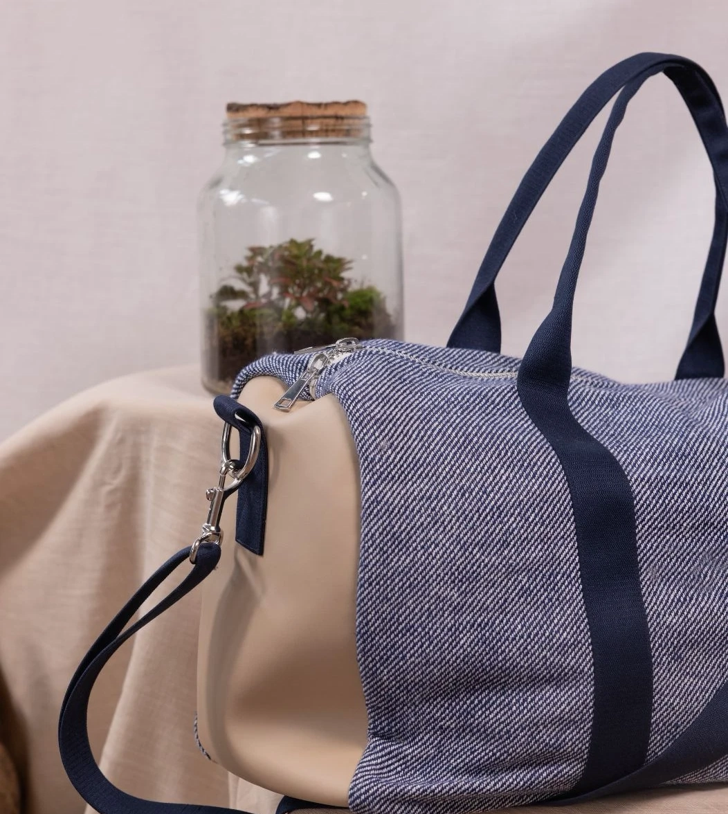 New York è il borsone da viaggio realizzato in tessuto esterno in denim e in fantasia blu con inserti laterali in vera pelle. I manici e la tracolla regolabile con passanti garantiscono resistenza e facilità di trasporto, in tinta con il tessuto esterno. La chiusura è con zip in metallo e i moschettoni laterali in acciaio. Internamente è foderato e dotato di una piccola tasca sul lato.