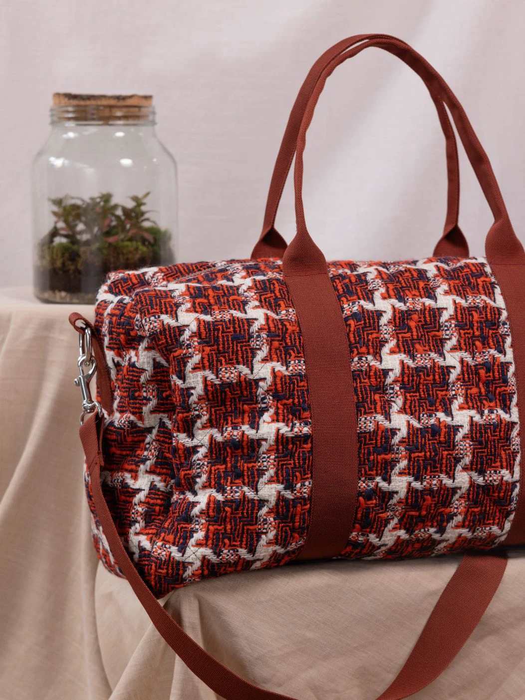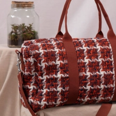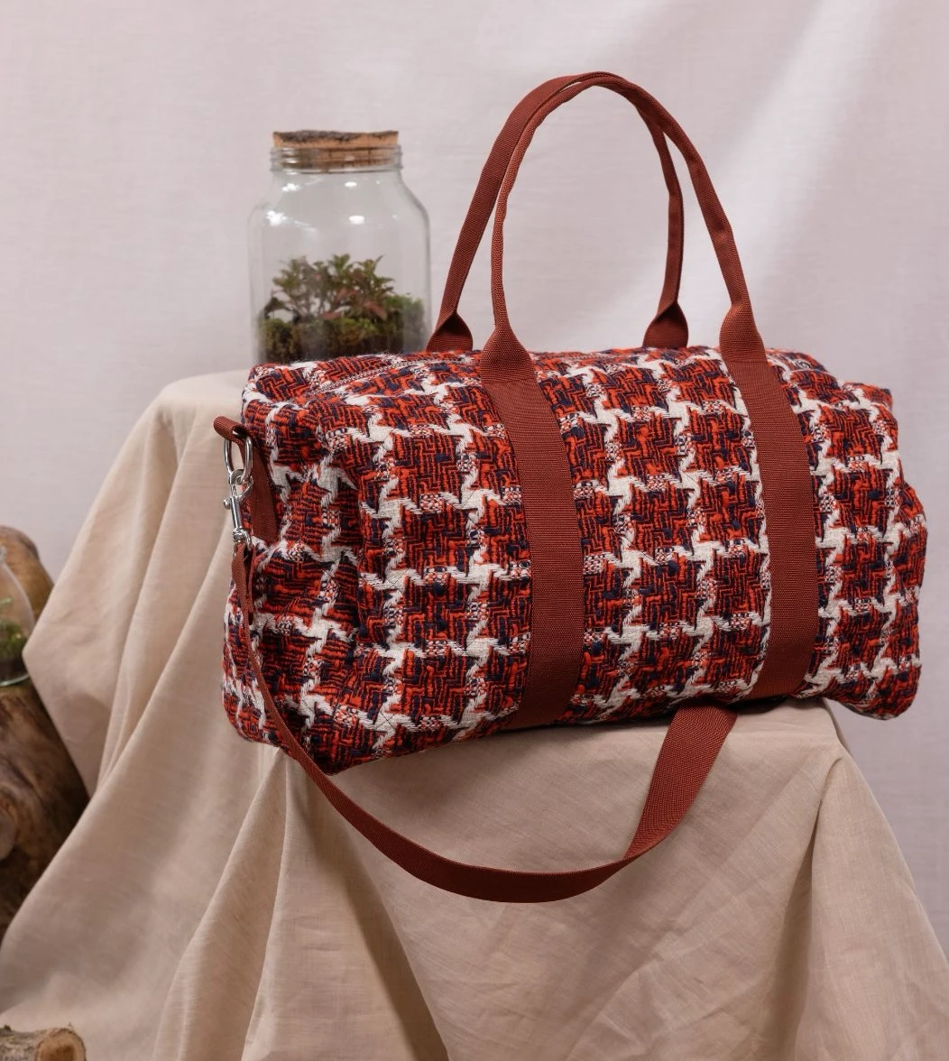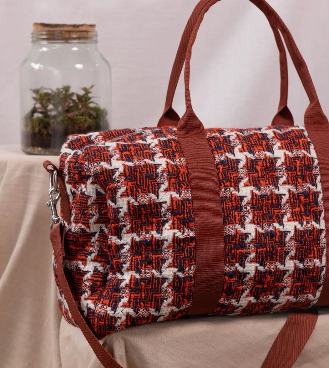 Seattle è il borsone da viaggio in morbido tessuto di lana trapuntato all’esterno e all’interno con fondo in vera pelle. I manici e la tracolla regolabile con passanti garantiscono resistenza e facilità di trasporto, in tinta o in contrasto con il tessuto esterno. La chiusura è con zip in metallo e i moschettoni laterali in acciaio. Internamente è foderato e dotato di una piccola tasca sul lato.