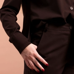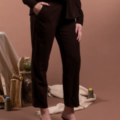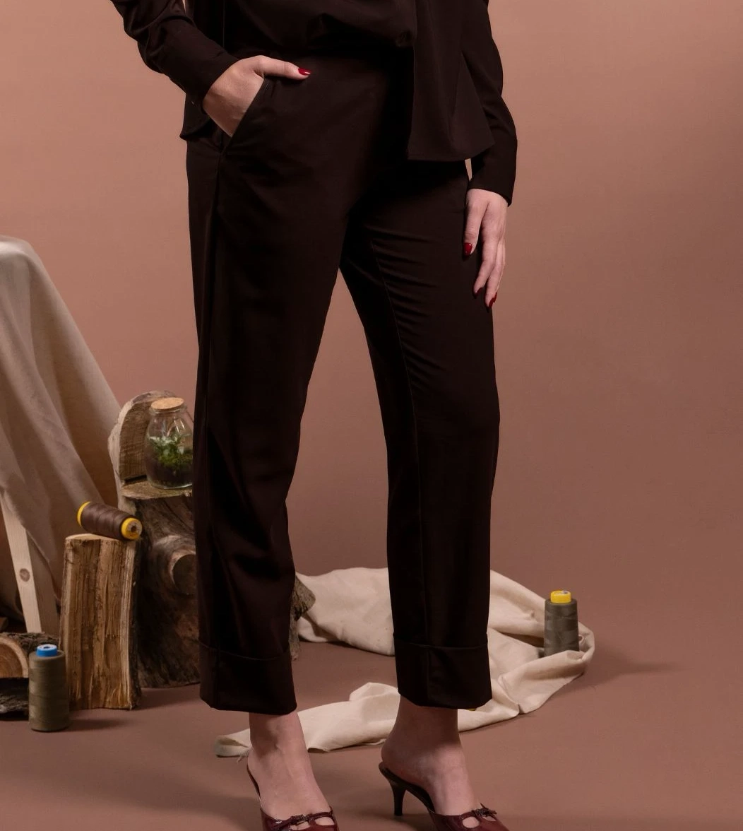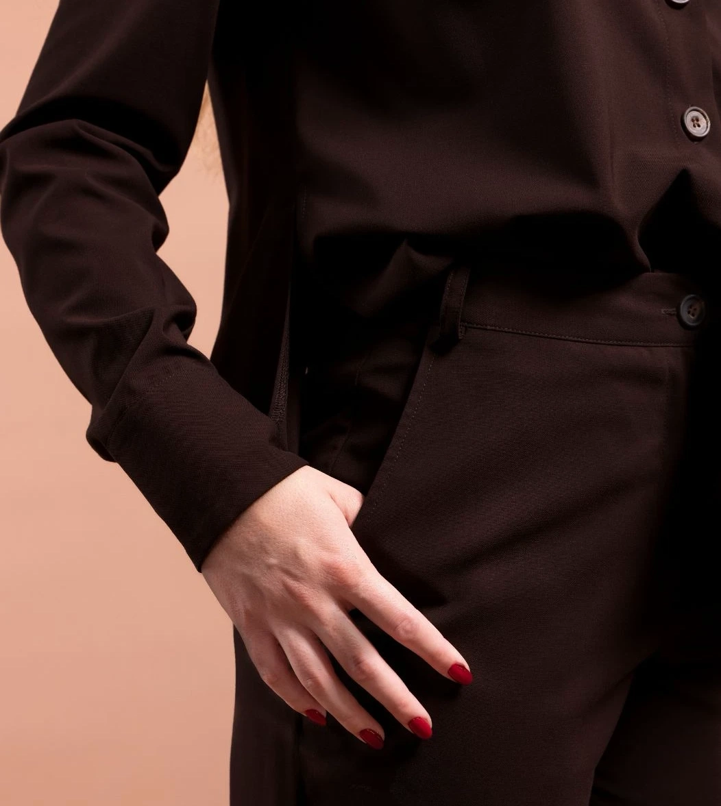 Dena è il pantalone del completo in frescolana color cioccolato e mocha mousse dal taglio lineare e dalla linea pulita ed elegante. Con tasche alla francese laterali, fascetta in vita con passanti e chiusura con zip e bottone al centro. Le pinces e le tasche a filo sul retro valorizzano la vestibilità. L’orlo sul fondo fermato con saldine laterali crea un taglio moderno appena sopra la caviglia.