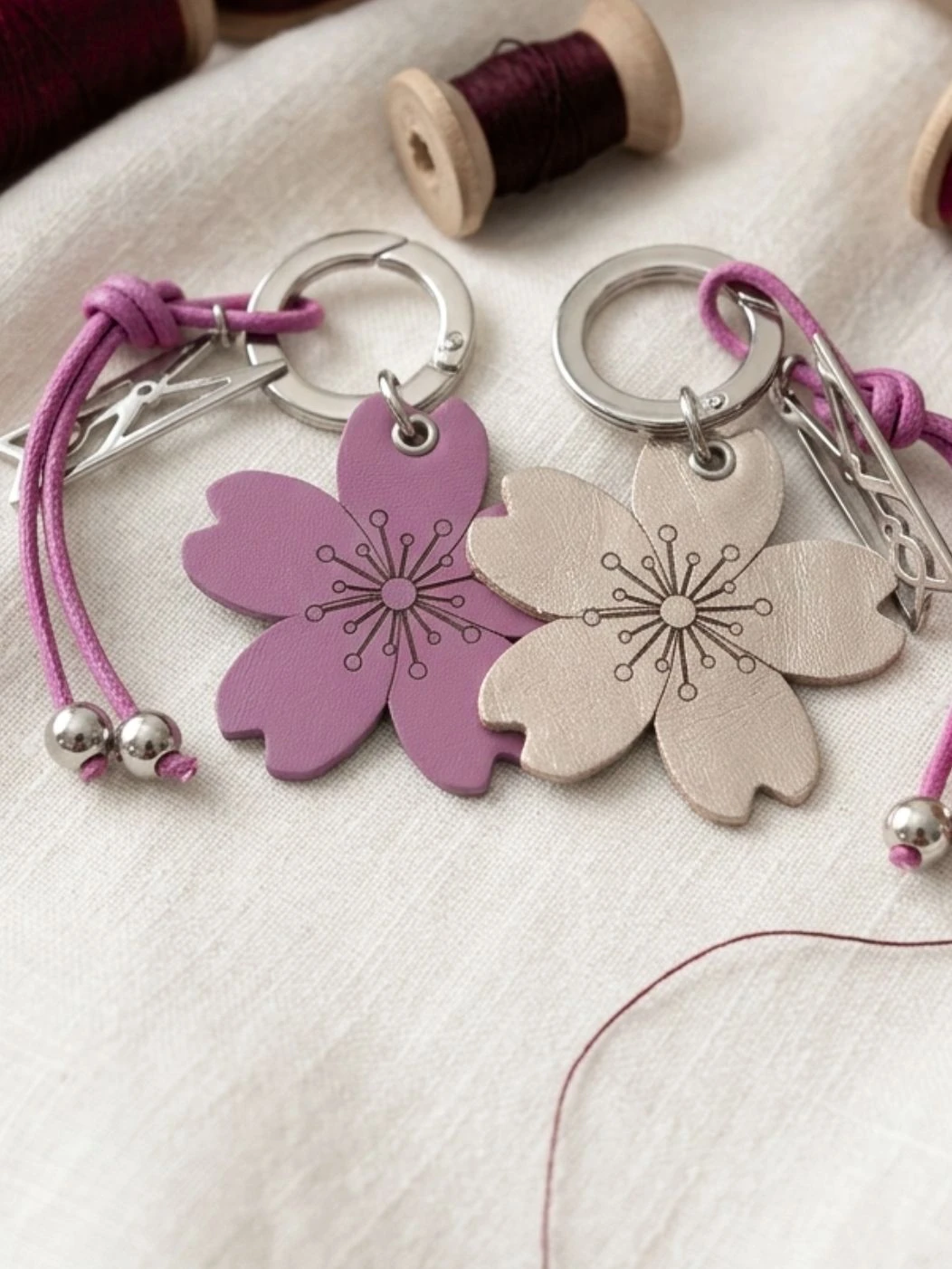 Portachiavi piatti in pelle a forma di cuore e fiore, anello con leva apribile. Disponibili nelle varianti del rosa e in colori cangianti. Ad impreziosire l'accessorio ci sono il cordino cerato con elementi in metallo e il charm con la molletta di Progetto Quid. Più di un'idea regalo, un invito a riconoscere la capacità di tornare a fiorire e generare cambiamento.