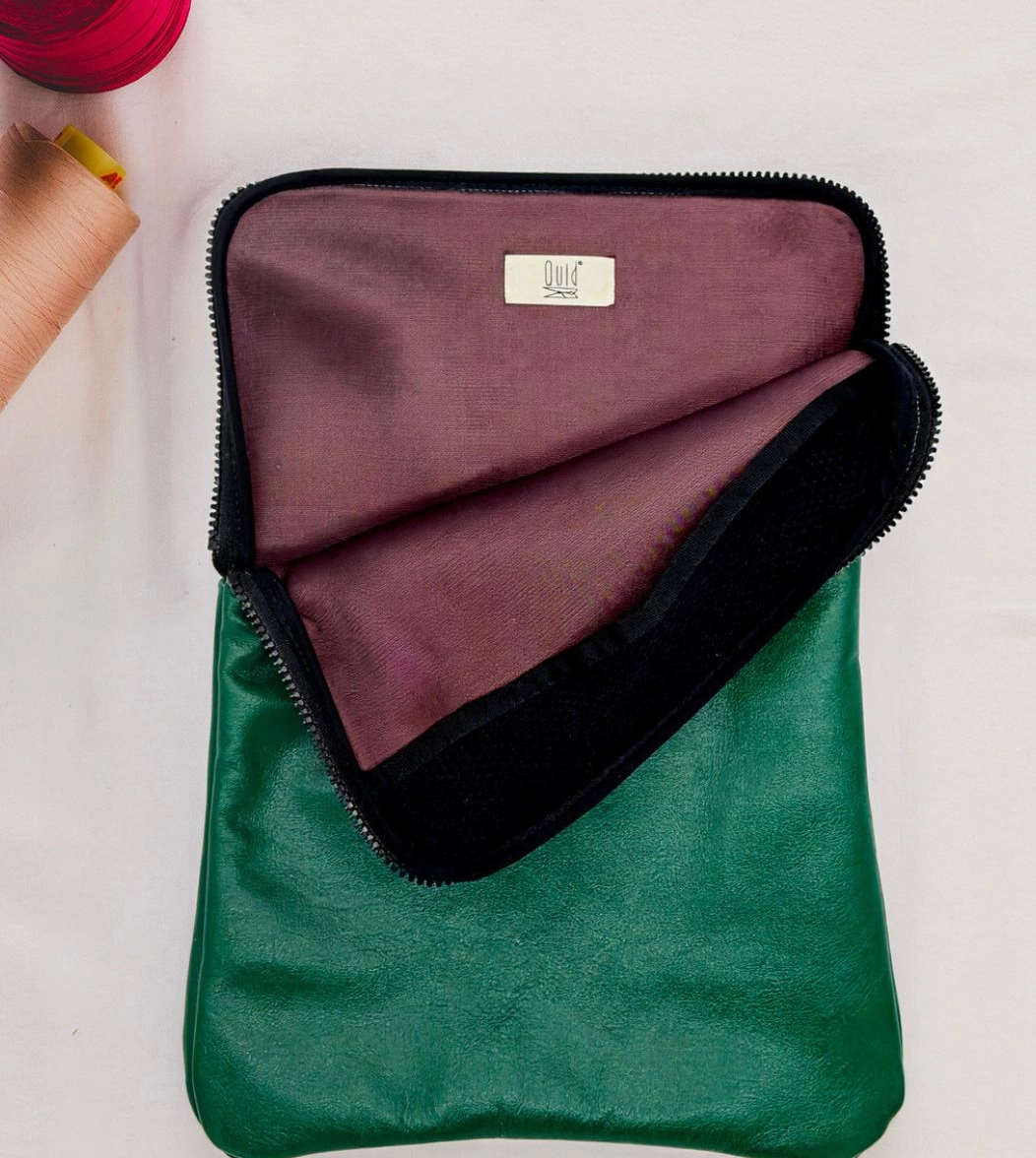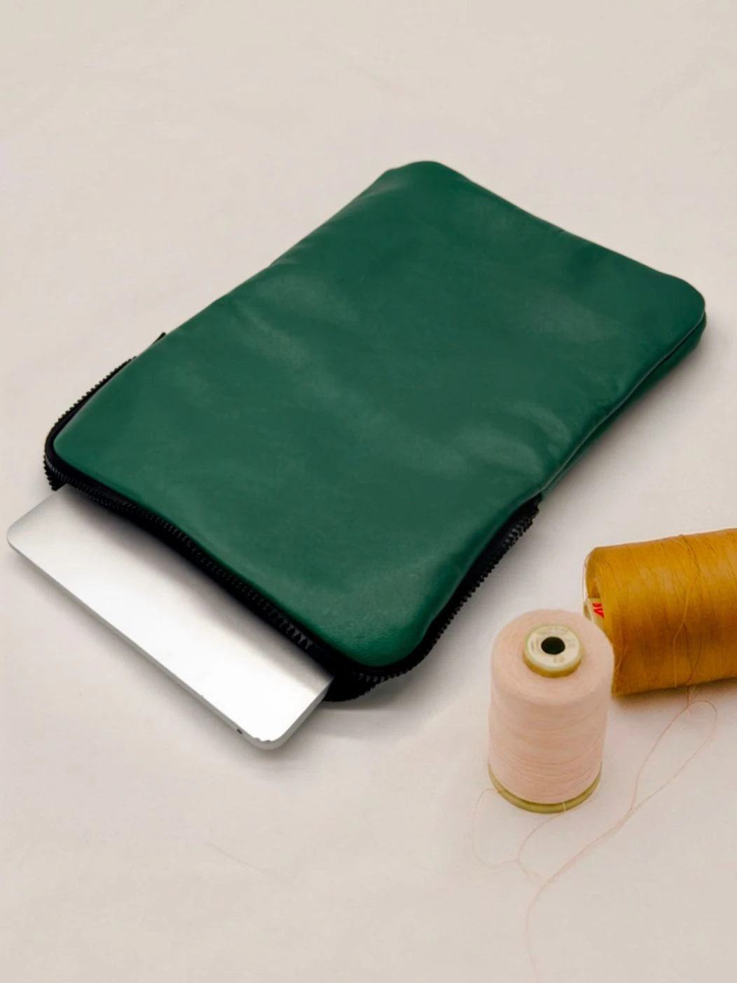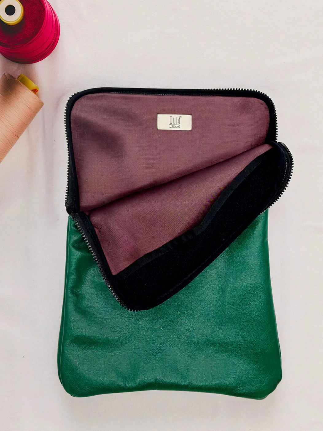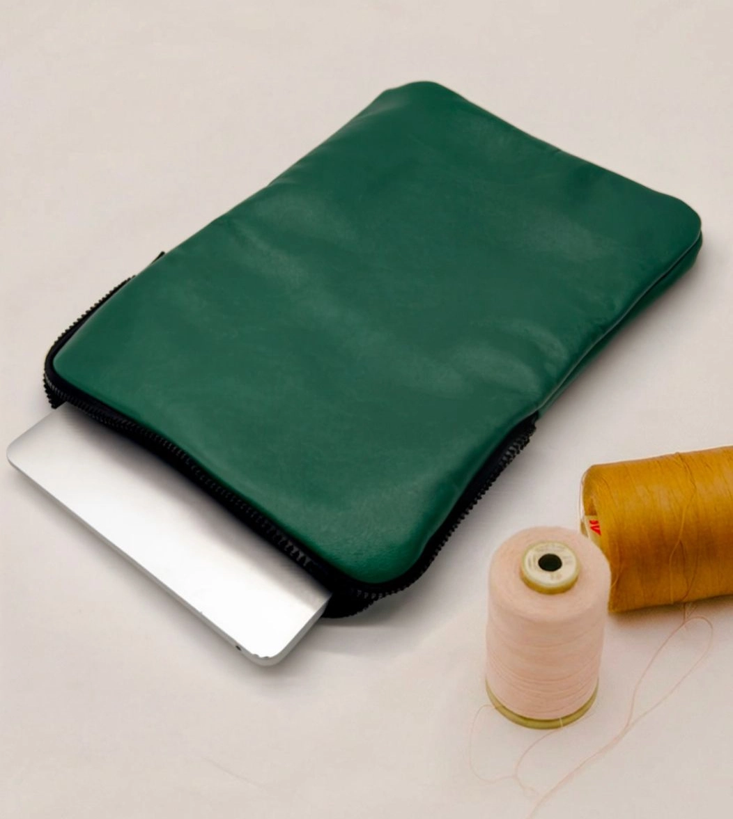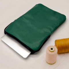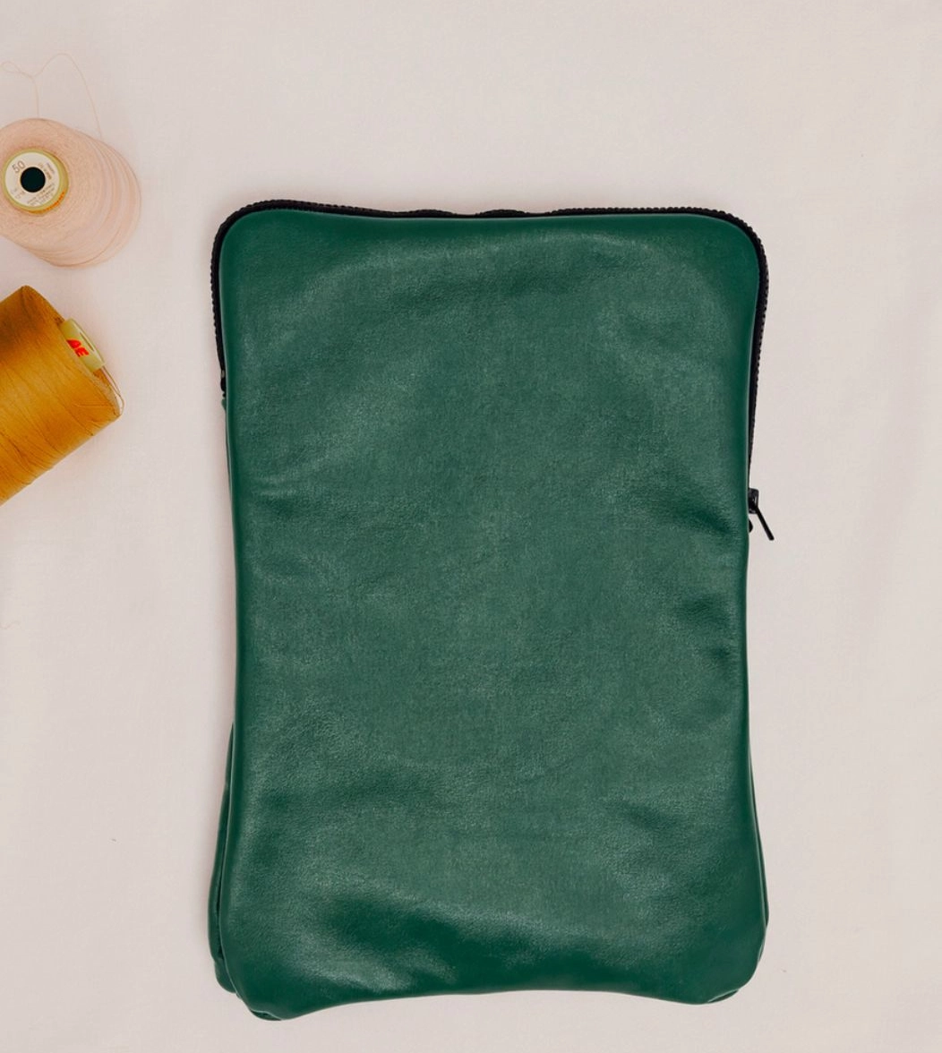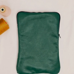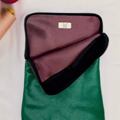 Custodia porta PC bordata in pelle disponibile in tinta unita, foderata all’interno con neoprene. Dotata di chiusura classica con cerniera e retina interna per mantenere saldo il portatile.