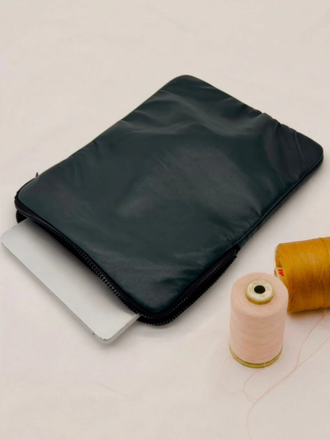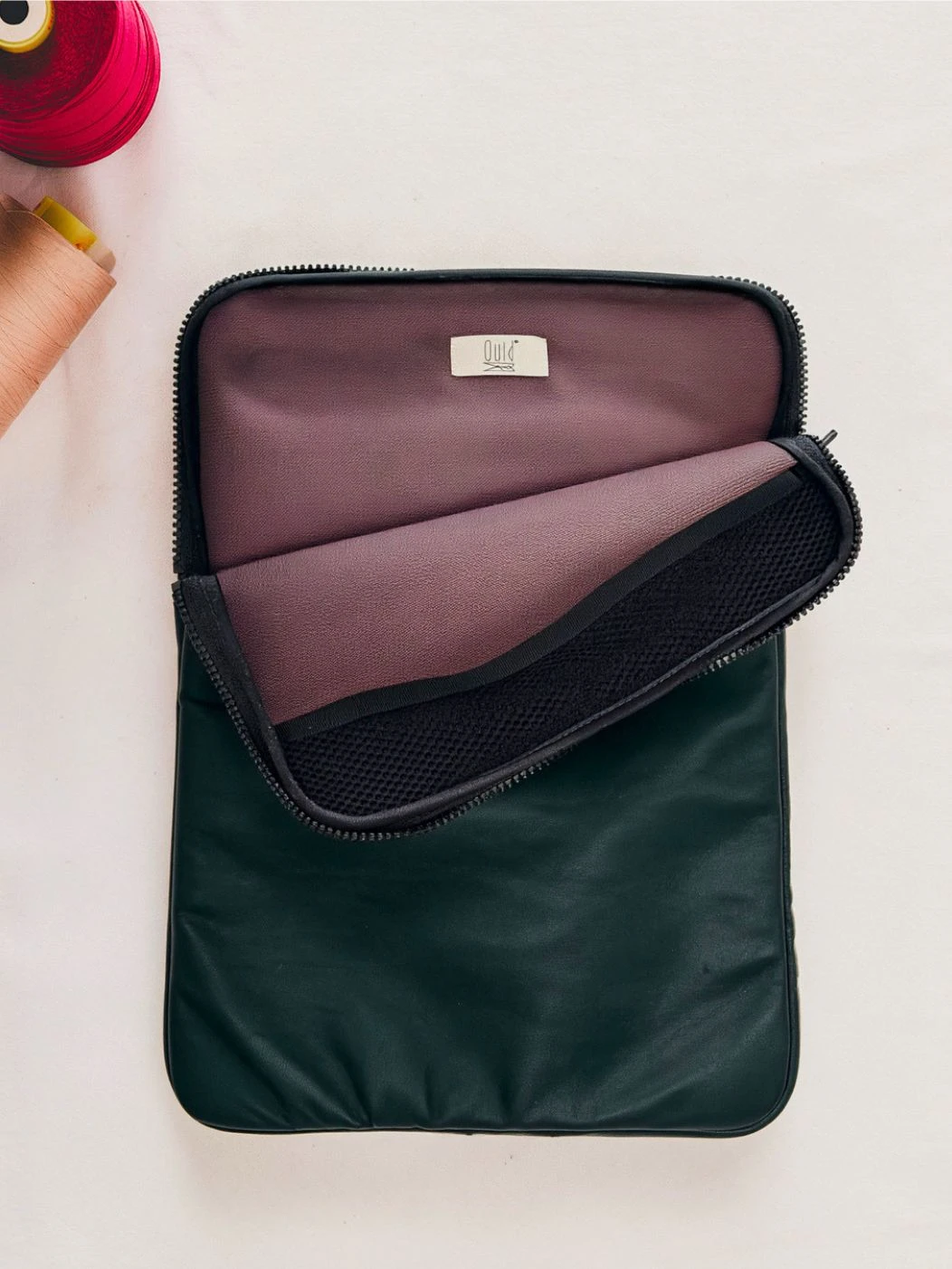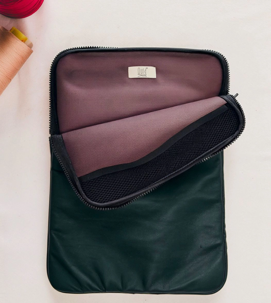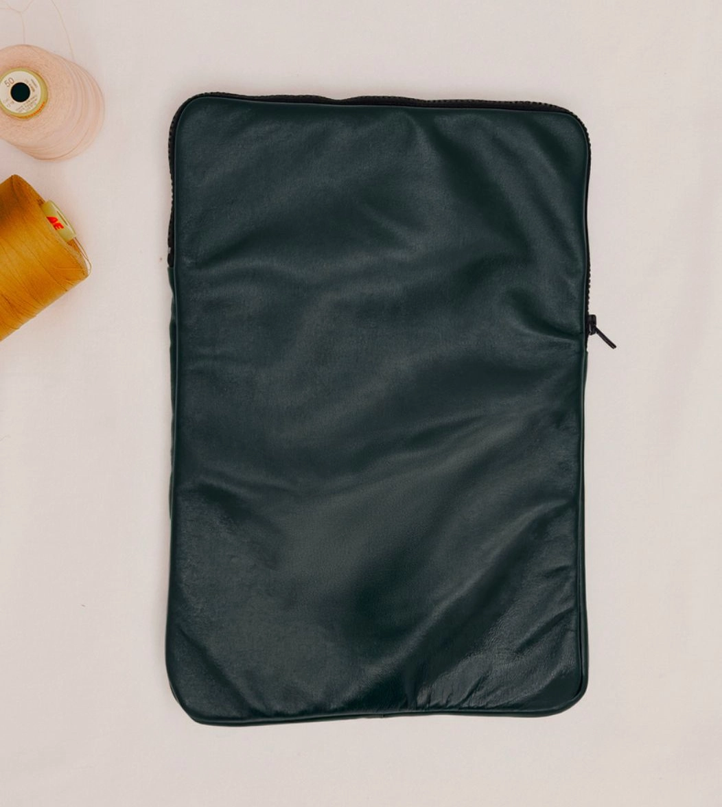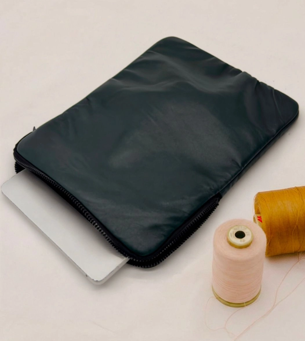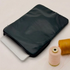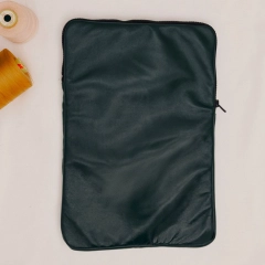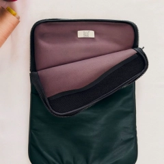 Custodia porta PC bordata in pelle disponibile in tinta unita, foderata all’interno con neoprene. Dotata di chiusura classica con cerniera e retina interna per mantenere saldo il portatile.