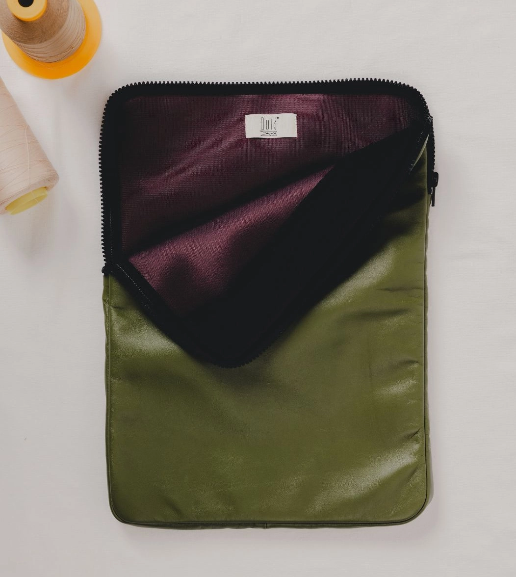 Custodia porta PC bordata in pelle disponibile in tinta unita, foderata all’interno con neoprene. Dotata di chiusura classica con cerniera e retina interna per mantenere saldo il portatile.