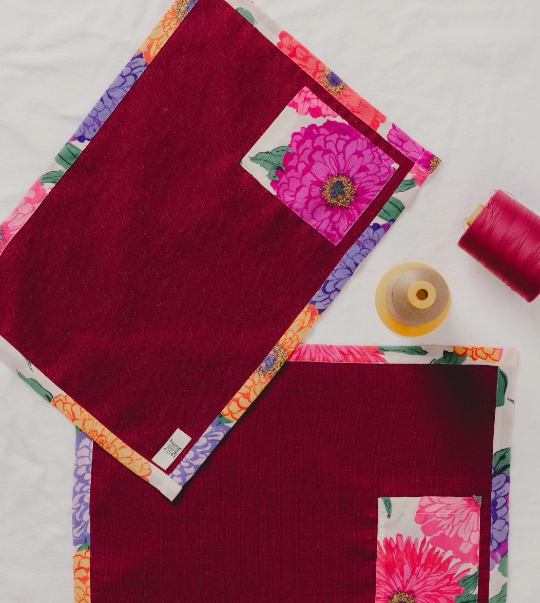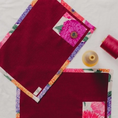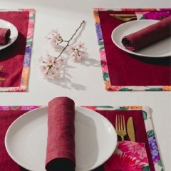 Realizzate in resistente tessuto pregiato di eccedenza con inserti a contrasto in fantasia: bordature e tasca. Dotate di tasche laterali per posate, toni brillanti e delicati apparecchiano la tavola donando colore e armonia, per condividere insieme momenti preziosi. Abbinale ai runner coordinati Swiss.