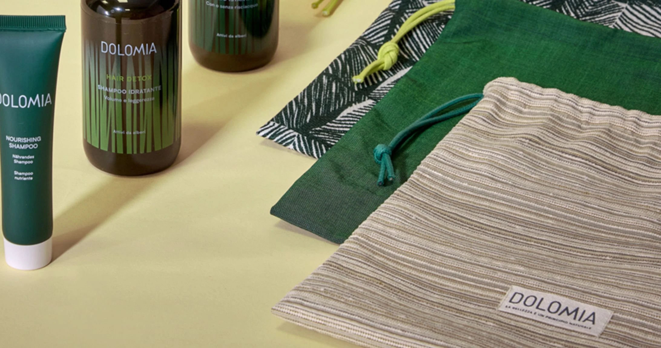 Nascono così dust bag in denim, cotone e altre texture in fantasia, rifinite con chiusure a coulisse, cordini cerati o nastri. Ogni combinazione di colore e fantasia è studiata per valorizzare il packaging dei trattamenti Dolomia e custodirli con eleganza.